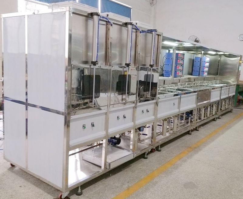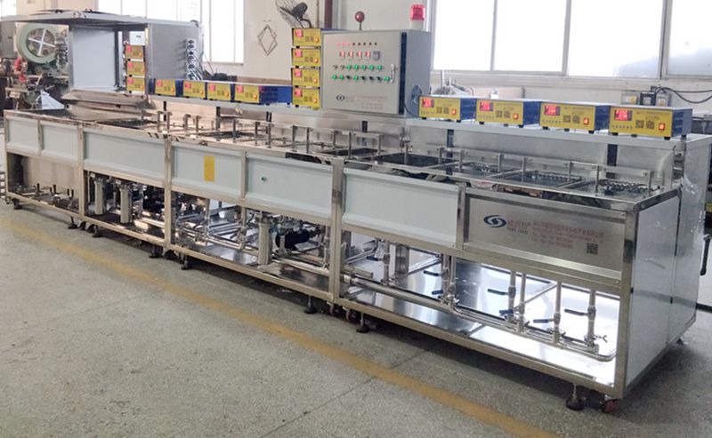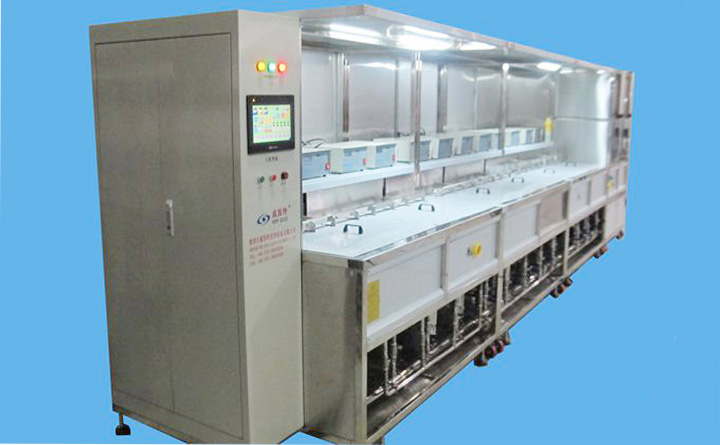 威固特微納超聲波清洗機此臺超聲波清洗機的槽體每槽設四面溢流口,溢水槽寬35 mm,各槽皆為獨立循環槽,由循環泵將洗劑由儲液箱抽出經過濾后再運回清洗槽,即子母槽循環。
