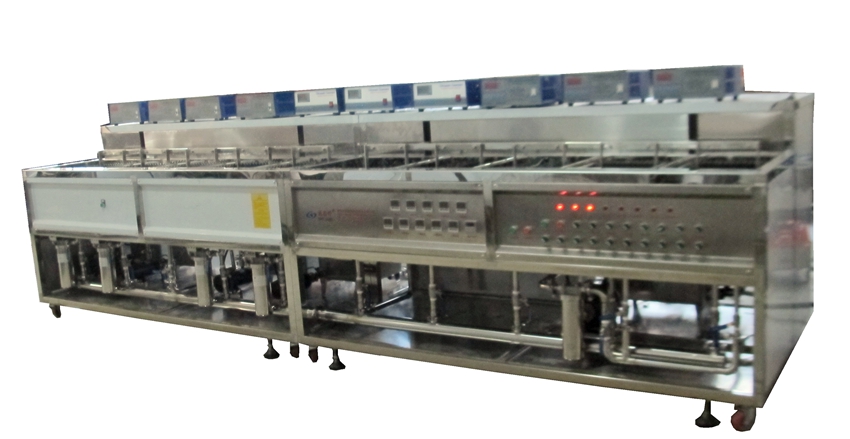 自動上料→1槽清洗劑超聲清洗28K→2槽清洗劑超聲清洗40K→3槽純水超聲漂洗28K→4槽純水超聲漂洗40K→5槽純水超聲漂洗40K→6槽熱風烘干→自動下料。