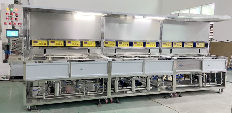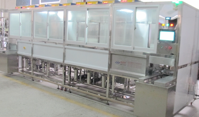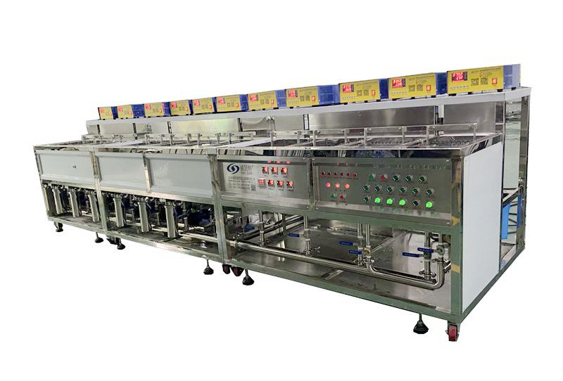 自動上料→洗劑超聲清洗→洗劑超聲清洗→純水噴淋洗→純水超聲清洗→純水超聲清洗→純水超聲波清洗→純水超聲波清洗→純水超聲波清洗→自動下料。