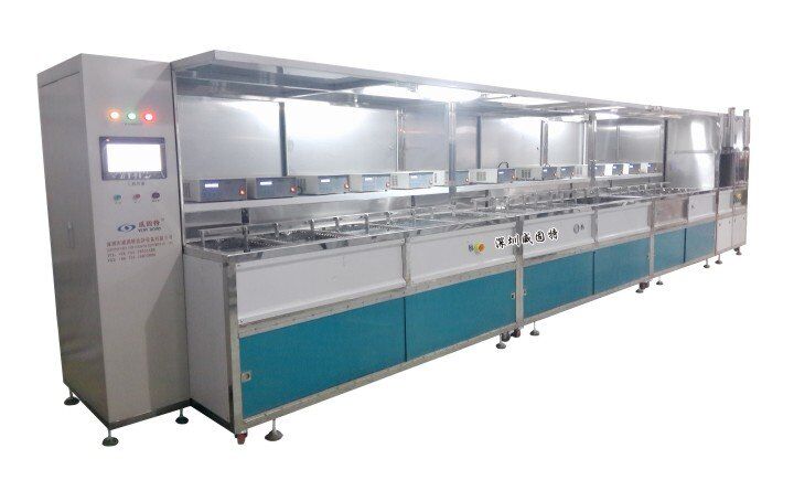 深圳威固特VGT-1509FT角反射器光學超聲波清洗機設備共有15個功能槽,配置有拋動系統(tǒng)、循環(huán)過濾系統(tǒng)、自動恒溫系統(tǒng)、超聲波清洗系統(tǒng)、定時系統(tǒng)、框架系統(tǒng)、CO2滅火系統(tǒng)等。設備采用環(huán)保型水溶劑洗滌、純水漂洗,為環(huán)保型清洗系統(tǒng)。